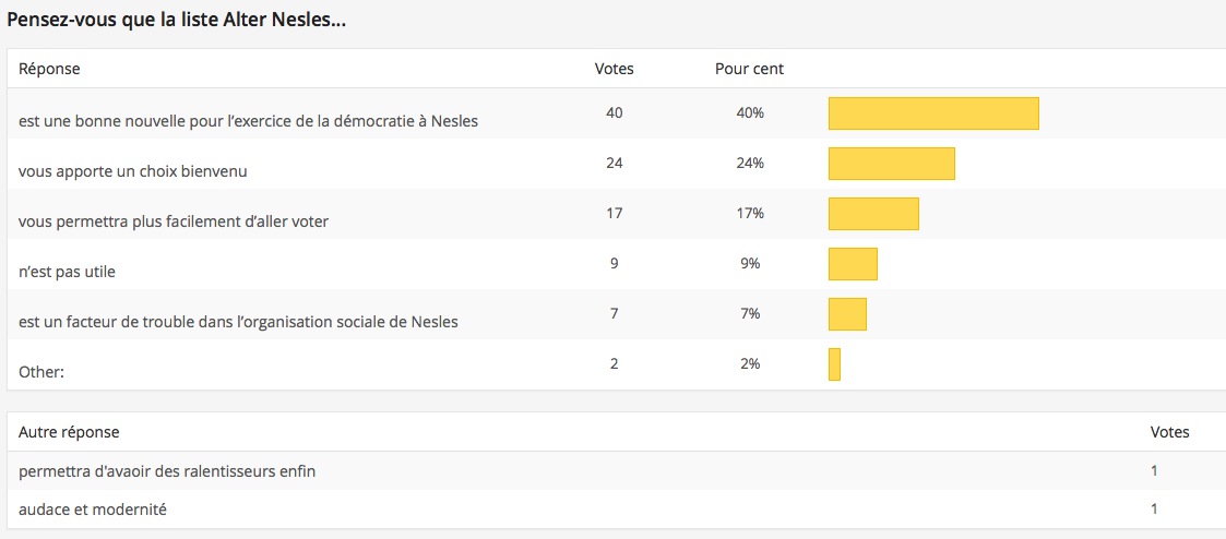 Premiers résultats après une dizaine de jours et une centaine de votes : une majorité de votants (et non des électeurs !) expriment leur satisfaction de voir une deuxième liste se présentant au suffrage, ce qui accrédite la démarche d’Alter Nesles. Merci.